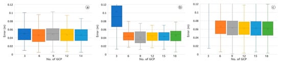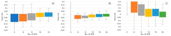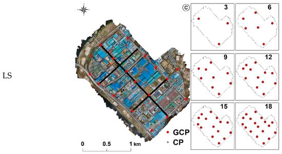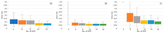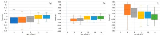 In the LS, the optimal accuracy was observed from six GCPs when considering the horizontal accuracy. The vertical and total accuracy shown excellent results when at least 12 GCPs were used, and the optimal accuracy was observed using 18 GCPs. In previous studies, the accuracy improved as the number of GCPs increased for very large areas, but the accuracy improvement alongside the increase in the number of GCPs was unknown [19,24,26,43]. In this study, the degree of improvement was not evident, either.
