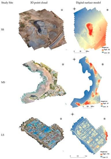 Figure 4. 3D point clouds (a) and DSMs (b) of the study sites.