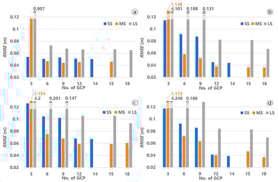 The SS’s horizontal RMSEs were 0.054 m (largest) for three GCPs and 0.050 m for 14 GCPs. The smallest RMSE of 0.050 m was observed when using 6 and 14 GCPs. The MS’s horizontal RMSEs were 0.117 m (largest) for three GCPs and 0.048 m for 18 GCPs. The smallest RMSE of 0.044 m was observed when nine GCPs were used. The LS’s horizontal RMSEs were 0.907 m (largest) for three GCPs and 0.065 m (smallest) for 18 GCPs.