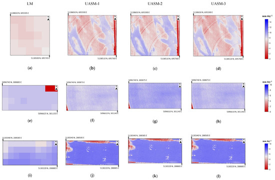 Figure 5. Sample daily ET maps from LM and very high resolution UASM-1, UASM-2, and UASM-3 approaches for spearmint (ad), potato (eh), and alfalfa (il) field crops.