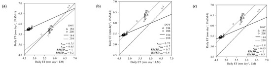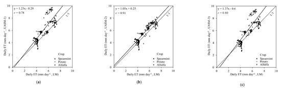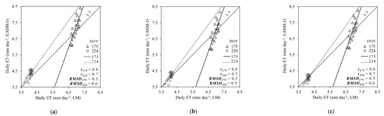 Figure 8. ET comparison plots between (a) LM and UASM-1, (b) LM and UASM-2, and (c) LM and UASM-3 approaches for alfalfa crop.