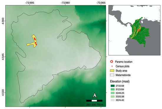 The study site is located at Parque Ecológico Matarredonda (4°33′38.1″ N and 74°0′7.3″ W) in the eastern range of the Colombian Andes, which is part of the Cruz Verde-Sumapaz páramo complex (Figure 1). Elevation ranges from 3100 up to 3600 m.a.s.l. The mean annual precipitation is 1178 mm; the mean temperature is 8.8 ºC, and the mean relative humidity is 88% [26]. Matarredonda comprises 690 ha of páramo ecosystem connected to the Cruz Verde-Sumapaz complex and surrounded by a matrix of forest, roads, and agriculture. In this páramo, vegetation is characterized by short and small growth forms composed by rosettes, shrubs, graminoids, forbs, and mosses. The Cruz Verde-Sumapaz complex has 1857 identified plant species. According to previous surveys, Matarredonda has approximately 30 vascular plant species [27]. However, our annual census has counted more than 97 species, including two the emblematic species in the genus Espeletia, Espeletia argentea, and Espeletia grandiflora [28]. Three soil orders have been found in Matarredonda; inceptisols, histosols and entisols that evidence high humidity levels and organic concentration and reveal past agricultural land use [29].