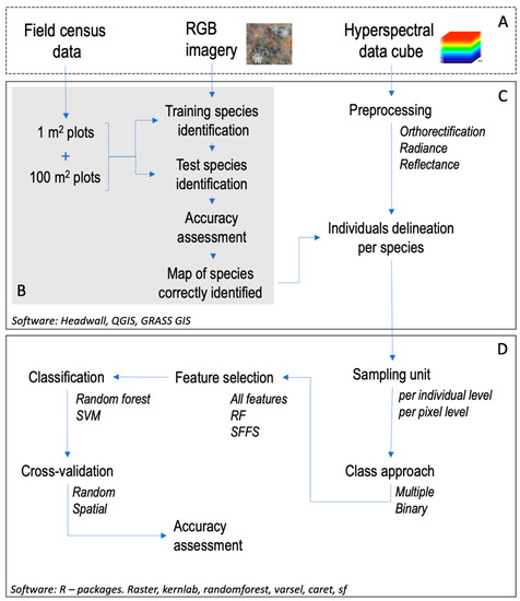 Workflow for species manual detection using red, green, and blue wavelengths (RGB) (B) and automated classification using Hyperspectral data, including preprocessing (C) and automated classification (D). Boxes in dashed lines (A) correspond to input data.