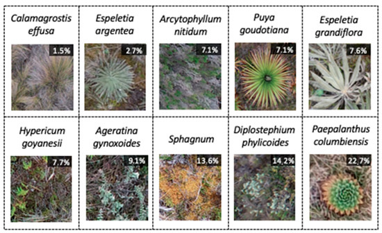 Despite the high diversity of short-stature growth forms and the large proportion of cloudy and rainy days throughout the year, acquiring the images was feasible. It only required a couple of hours of clear sky to obtain 1cm pixel-resolution used in this study. Previous research has highlighted the importance of this type of imagery in different types of ecosystems from big trees in highly diverse tropical [46,47] and subtropical forests [48], to small stature species in temperate grasslands [49], in a diverse set of ecological studies that include mapping, restoration and monitoring [50,51,52]. In this study, we conclude that high-resolution imagery (1 cm pixel) has great potential for at least 21% of the species, comprising a range of growth forms from big rosettes (P. goudotiana), endemic species (Espeletia sp.) to mosses (Sphagnum sp.), that are known to be essential in this ecosystem [53,54,55]. Such an outcome shows the potential of UAV-borne RGB imagery for low-cost, in terms of time and money, efforts to visually detect changes in the species composition and enhance ground surveys and inform the development of the automated image classification techniques explored in this study.