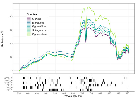The selected spectral bands using SFFS and RF approach were spread across the spectrum with two clusters located between 420 and 630 nm, 735 and 840 nm. Different bands were selected for each image, with marked differences in image A and RF feature selection, for which the selected bands are between 550 and 800 nm (Figure 4). The most considerable differences in spectral values among species are located in the NIR zone of the spectrum, where the rosette P. goudotiana has the highest reflectance percentage values while the grass C. effusa has the lowest. These differences are likely to be related to the larger proportion of necromass that usually surrounds grasses compared to the green foliage of the bromeliads. The spectral signature of two species of the same genus, E. grandiflora and E. argentea, important endemic species of the páramo ecosystem, can be visually differentiated with higher reflectance percentage for E. argentea in the visible range in comparison with E. grandiflora, while the NIR zone E.grandiflora shows higher values than E. argentea (Figure 4).