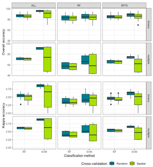 Variation in model performance in terms of overall accuracy and kappa accuracy given the combination of feature selection, class grouping method (Binary or Multiple), classification method (Random forest (RF) and Support vector machine (SVM)), and cross-validation method (Random, Spatial). In the case of feature selection: all the spectral bands (ALL), spectral bands selected using Sequential Floating Forward Selection (SFFS) using Jeffries–Matusita distance as a separability index (FSSF) and, spectral bands with the highest importance on random forest the Gini decrease mean value (RF).