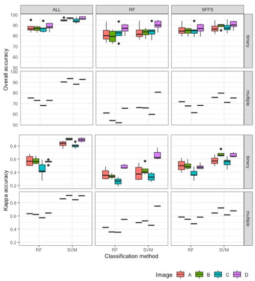 As presented in Figure 6, overall and kappa accuracy were similar across images when all the bands were included, independent of the number of classes or the classifiers used. However, when a feature selection method was applied (SFFS or RF), lower overall and kappa accuracy values were observed (SFFS > RF) accompanied with a higher variation between images. This pattern was especially visible when features were selected using RF.