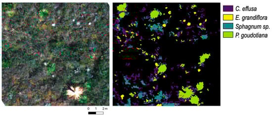 Example of classification results using binary classes, sequential fast forward feature selection (SFFS) and SVM classifier, compared to the view from a false color representation of the hyperspectral data for C. effusa, E. grandiflora, Sphagnum, P. goudotiana.
