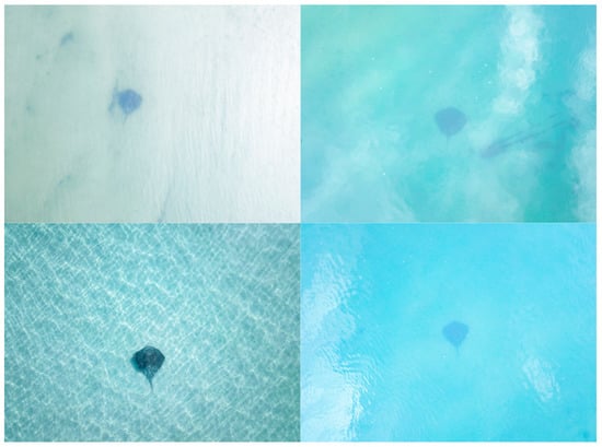 It is important that drone studies do not overstate their findings, given that observations are limited to the portion of the rays’ range within shallow habitats. Detection reliability is likely to decrease in habitats exceeding depths of 5 m [28,65,66,67]. This depth recommendation is subject to change as a result of water quality, weather conditions and the complexity of the substrate, where low-contrast highly complex substrates will make detection more difficult (Figure 2). A polarised lens can also be used to reduce the effects of glare on the surface of the water [38,67] and improve detection in a range of environmental conditions. Simply adjusting the drone orientation to fly with the sun behind it and tilting the camera to off-nadir can also help [70]. However, unless there is excellent water clarity, drone studies will often be restricted to habitats that do not exceed 5 m in depth. To determine the detection depth at different sites, life-size models can be deployed and photographed at different altitudes during a variety of tide heights and weather conditions [18]. Alternatively, experiments will need to include protocols for when rays enter in and out of detection within deeper waters. This may involve a time limit between detections after which the observation is terminated. Pairing tagging or remote operated vehicle (ROV) data with drone data may also provide insight into the behaviours of the rays as they come in and out of vision.