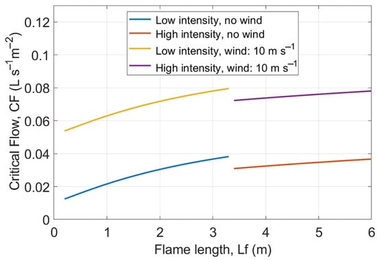 In Section 2, the critical flow rate is computed as a function of the fire intensity , which can be evaluated by using the flame length (Equations (4) and (12)) or the rate of spread depending on wind speed and moisture content (Equations (13)–(15)). The computation of is valid for various fuel models, but some of the coefficients depend on the vegetation chosen. Table 3 and Table 4 show the coefficients used with their bibliographic references. For parameters depending on the type of vegetation was selected the Mediterranean scrub, while in Hansen’s paper [40] coefficients are referred to Pinus pinaster.