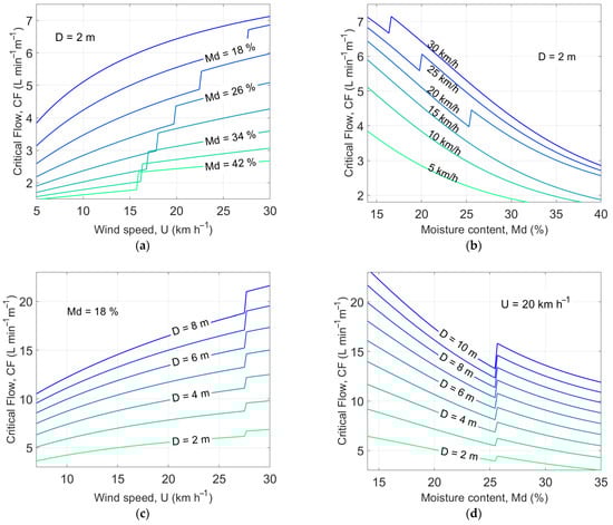 2.3. Critical Water Flow Rate CF as Function of Wind Speed and Moisture Content
