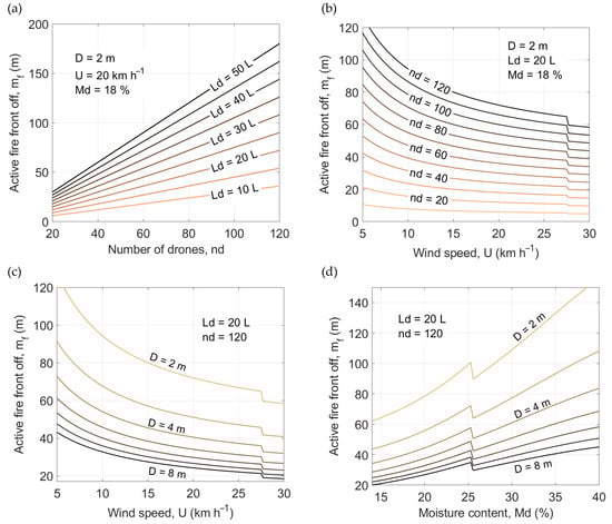 As an example of a possible strategy, we assume that fire conditions need a of . According to Figure 3a, such is required for example in a fire with wind speed of , moisture content of , and active flame depth of . We consider a scenario in which 12 drones carrying a payload of 20 L and completing a round trip in min. Such drones are capable of extinguish linear meters of fire front corresponding, for , to an area of . Indeed, by using Equation (24), we obtain:
