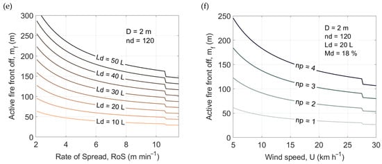 where is the wind speed measured at 2 above ground level in , , , and are parameters obtained experimentally by non-linear regression analysis for Mediterranean scrub, and is the moisture content percentage of the elevated dead fuels. In experimental studies, is determined by weighing samples of vegetation before and after drying them, which means that the formula depends on the type of vegetation. Differently from [48], the rate is multiplied here by 0.06 to be expressed in . Using Equations (4), (13) and (14), the required to extinguish section of active head fire front is obtained as a function of wind speed and moisture content . Moreover, is multiplied by 60 s and by the flame depth (i.e., the width of continuous flaming behind the leading fire edge) to obtain the water flow rate in linear meters instead of square meters ():