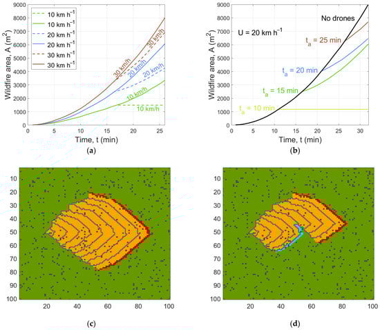 Figure 5 shows the effects of the platform ( drones each carrying L) impact on the evolution of a wildland fire. In particular, in Figure 5a the variation of the area in time without any extinguishing intervention and with the intervention of the firefighting method is depicted for wind speed of , , and . Drones start to arrive 15 min after fire ignition and the moisture content is assumed to be for grassland and for shrubland. A platform is able to completely arrest the fire for wind speed of 10. Figure 5b shows the variation of the area in time with wind speed fixed at compared with to the spread without any intervention. Drones start the intervention at times . Finally, Figure 5c,d illustrate the fire evolution fronts without any extinction and with the intervention of drones at (positioned along the blue line and corresponding to cells), respectively. Even if a single platform is not able to completely extinguish the fire in these conditions, it is nevertheless effective in containing its advance. The use of two platforms allows the complete extinction in that case.