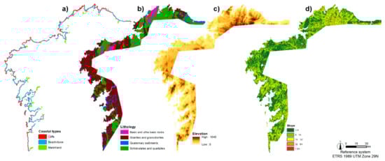 Main characteristics of the Galician coastline. (a) Coastal types in Galicia; (b) lithology of coastal areas in Galicia; (c) elevation of the Galician coast, in meters; and (d) slope in the same sector.