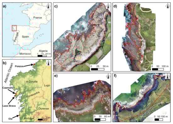 Location of study sites. (a) Location of Galicia in Europe; (b) location of the study sites (red points) in the western coast of Galicia; (c) Oia study site (41.998; −8.879); (d) Caamaño shore platform (42.655; −9.041); (e) Laxe Brava site (42.598; −9.075); and (f) Ponzos cliff site (43.561; −8.254).