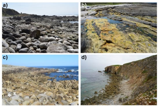 Photographs of study sites. (a) Oia boulder beach; (b) part of the Caamaño shore platform with its lithological variations; (c) Laxe Brava boulder beach; and (d) north section of Ponzos cliff site.