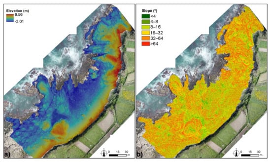 Oia is located in the SW coast of Galicia. This area has been monitored since 2012 [,], and previous works have analyzed variations in a natural boulder beach based on information from UAVs using different techniques. It constitutes one of the first areas analyzed with these vehicles. As described in previous works [,,,], the boulder beach is approximately 20 m wide and 100 m long. This boulder beach is located at the edge of a shore platform and is limited by two rocky promontories to the north and south. The majority of boulders come from the erosion of the back cliff formed by fluvio-nival deposits in a cold environment more than 40,000 years ago []. The beach is composed of heterometric boulders, with the largest ones exceeding 60 cm along their major axis, and it sits at the northern section, while decametric clasts are accumulated in the southern section. The substrate is dominated by intensely fractured two-mica granites. This area shows low elevations, reaching 8.56 m at the cliff toe, while a major portion of the shore platform and part of the boulder beach belong to the intertidal level (Figure 5a). Figure 5b shows the slopes of this site, which show a great variability that is clearly related to the boulder accumulations that define their landscape.