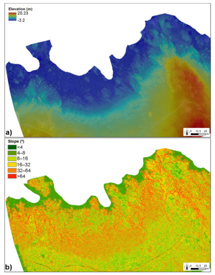 Figure 6a shows elevation in this area, which is homogeneous in the active boulder area and reaches 20 m in the distal sections of the platform and along the edge of the study site, which protects part of this area from marine influence. As in the previous case, Figure 6b clearly shows boulder distribution based on their contour in the slope map, which becomes smoother in the landward beach zone.