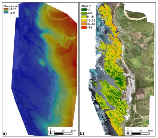 Figure 7a shows elevation distribution throughout the entire site. In this case, the shore platform area reaches an elevation of 4 m. The highest values occur in the southern area, while elevation is below 3 m in the rest of the shore platform. As for the slope, major differences were observed between the central section, with lower values, and the edges, with the highest slopes (Figure 7b).