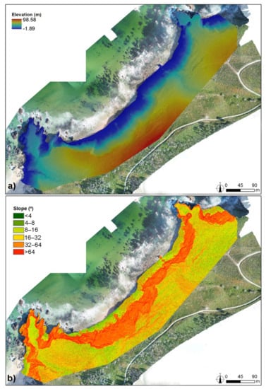 In this case, the analysis focused on an 800-m-long section selected as a pilot area to validate different tools for monitoring cliff areas. Figure 8a clearly shows the elevation distribution in this area, with cliffs exceeding 100 m in the central section. Moreover, an analysis of the slopes (Figure 8b) confirmed the wide variety of this zone. These variations are related to the materials accumulated at the cliff toe and to the presence of almost vertical areas, especially in the central section, many of them exceeding 75°.