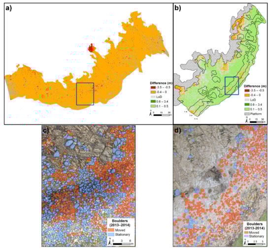 Analysis of spatial variations and variations in boulder position in Laxe Brava and Oia. (a) Elevation difference in the Laxe Brava site between 2014 and 2016; the blue polygon represents the area detailed in (c); (b) variations in elevation in the Oia area during the 2014–2016 period; the blue polygon represents the area detailed in (d); (c) boulders movement in Laxe Brava during the 2013–2014 period; and (d) variations in boulder position in Oia between 2013 and 2014. Figures adapted from [,,,].