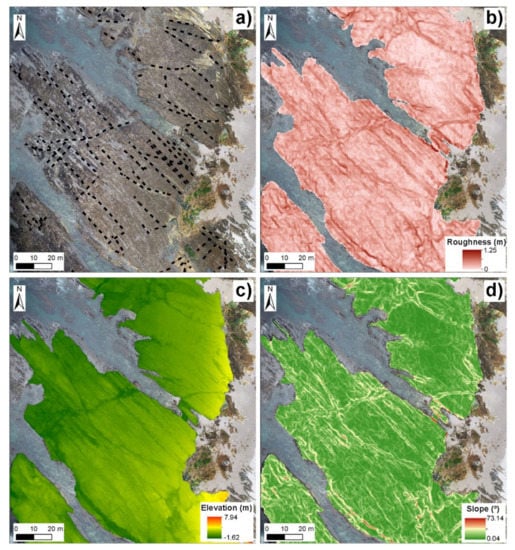 Figure 10 summarizes the main characteristics of a specific section of the Caamaño shore platform. First, joints were traced due to their key role in understanding platform evolution and analyzing the more erodible areas. These values are closely related to roughness and slope (Figure 10b,d), which explains the importance of taking these variables into account for shore platform characterization. As for elevation, Figure 10c clearly shows hollow areas in the platform and also allows identifying the most resistant materials by the higher elevations with which they appear.