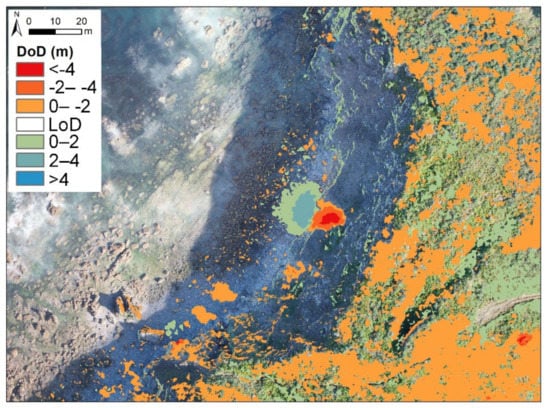 More recent projects have also employed high-resolution images using SfM techniques. This technique was used to generate digital surface models (DSM) to analyze spatial and volumetric variations. based on this information, techniques such as geomorphic change detection (GCD) [] were applied to identify and quantify differences among several dates, through a raster file with the DEMs of difference (DoD), and to identify the areas with the greater losses or gains during the analyzed period [,]. In these analyses a Limit of Detection (LoD) was applied based on the uncertainty of raw data and the processes. This value varied in both sectors, 3.71 cm in Oia and 1.5 cm in Laxe Brava. The uncertainty estimation and its reduction is one of the most important elements to improve these studies.