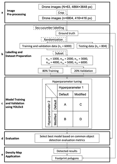 Data were processed through five major steps (Figure 2): (a) pre-process drone images; (b) use bounding boxes to label holothurians as required by YOLOv3 and prepare different sized training datasets to investigate the influences of dataset size on training results; (c) train and validate models using YOLOv3 deep learning object detection algorithm by tuning zero, one or two hyperparameters (for details see Section 2.3.3); (d) evaluate and determine an optimal holothurian detection model using common object evaluation metrics; and (e) apply the optimal detection model to map the sea cucumber density in the area of interest.