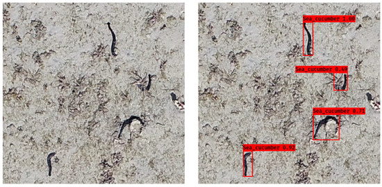 Detection result sample. Left: cropped image before detection. Right: detected results with bounding boxes and detect confidence plotted on each sea cucumber.