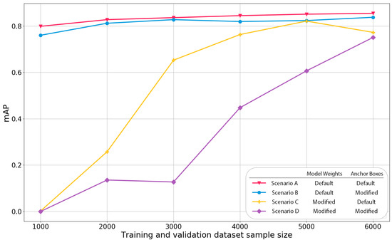 The mAP results (Y-axis) computed on the ultimate unseen dataset under the different training sample sizes (X-axis) and hyperparameters (scenarios A-D, please refer back to Section 2.3.3).