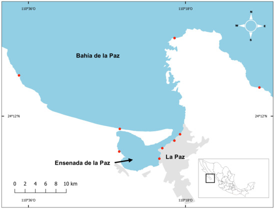 Areas where the drone was utilized to record Larus livens behavior (red points) in the city of La Paz and coastal surroundings in the Gulf of California during 2019 and 2020 in Baja California Sur, Mexico.