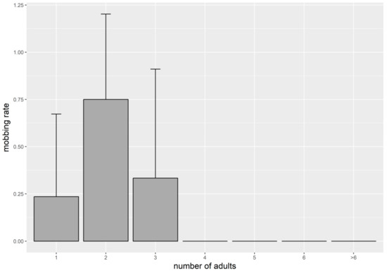 Mobbing rate of Larus livens related to the number of adults within the group of gulls in the La Paz urban matrix and surroundings, Baja California Sur, Mexico.