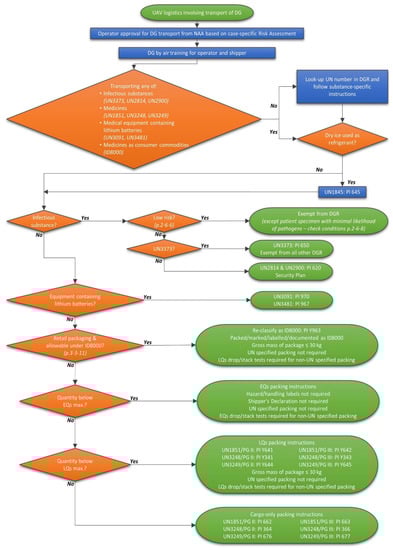 The key points have been extracted from the results and discussion of the research and formulated as a list of issues UAV operators should consider when making an application to transport DG (Table 5). It should be remembered that this is an evolving area of regulation, meaning that there is often no definitive rule or procedure to follow. Guidance for operators transporting the DG identified as likely to be involved in UAV medical logistics (Table 1) is provided as a flow chart in Figure 1.