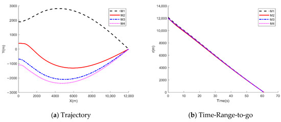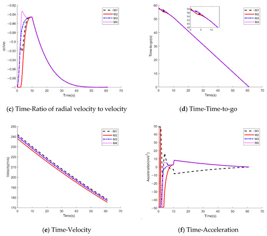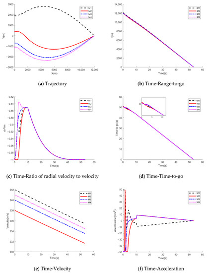 The simulation results are shown in Figure 4. It can be seen from Figure 4a that all four UAVs can gradually fly to the target. As can be seen from Figure 4b, the distance between each UAV and the target is getting closer and closer, and finally decreases to 0, which indicates that the four UAVs can hit the target accurately. As can be seen from Figure 4c, the of the four UAVs are inconsistent at the initial time, but reach the same after 8 s, which indicates that the cooperative guidance law can make the reach the consistency quickly, and also means that the time-to-go of four UAVs reach the consistency within 8 s. It can be seen from Figure 4d that the time-to-go of the four UAVs can quickly converge to the consistency within 8 s, which shows that the cooperative guidance law makes the time-to-go reach the consistency quickly, and also shows the correctness of the analysis in Figure 4c. It can be seen from Figure 4e that the velocity of the four UAVs decrease linearly with time, which shows the effectiveness of the cooperative guidance law when the rate of change of velocity is the first order function of velocity. It can be seen from Figure 4f that the overload amplitude of the four UAVs is relatively large in the first 3.5 s. According to the analysis of Figure 4c, this is because the deviation of is relatively large in the initial 3.5 s, and a large overload is required to make the converge to the consistency quickly, which reflects the advantages of fast convergence and strong robustness of cooperative guidance law with finite time. In addition, although the overload command is large in initial 3.5 s, it is still within the available overload range of [−10 g, 10 g], so the algorithm has certain engineering application potential. There is a certain sudden change in the overload command around 10 s, which is caused by switching the cooperative guidance law to the proportional guidance law. After 10 s, under the action of proportional guidance law, the overload command amplitude of each UAV gradually decreases and converges to 0 in the final stage.