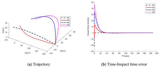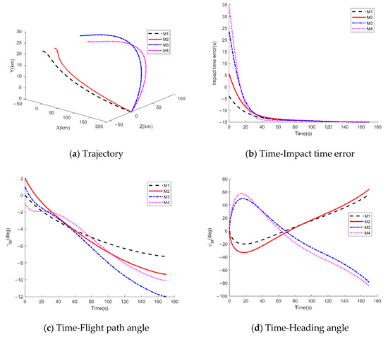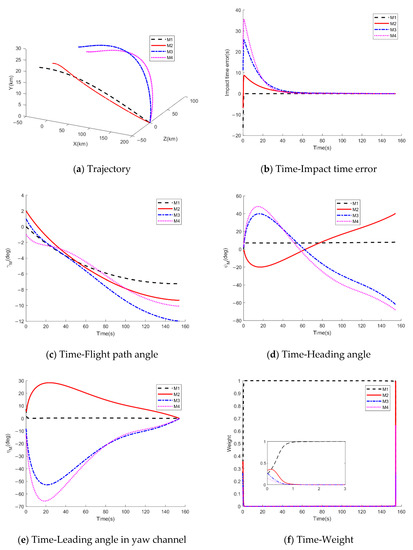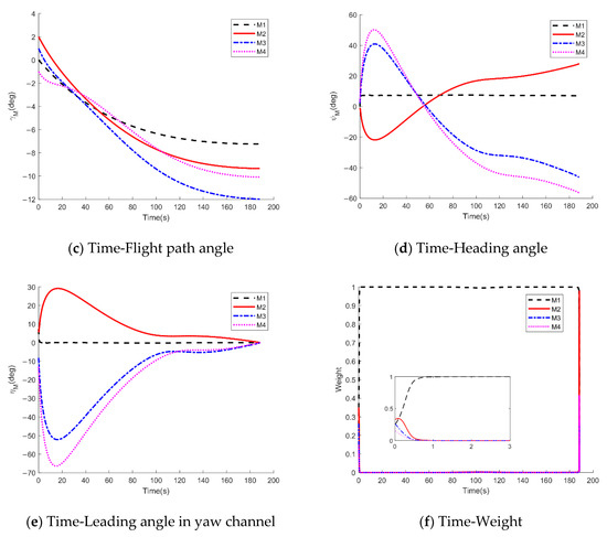 Figure 7a–f show the variation curves of three-dimensional flight trajectory, impact time error, flight path angle, heading angle, the leading angle of velocity in yaw channel and the weight with time respectively. As can be seen from Figure 7a, all four UAVs can reach the specified target point. As can be seen from Figure 7b, the impact time errors of the four UAVs converge to 0 at terminal time, and the desired impact time obtained through negotiation is 188.2 s. As can be seen from Figure 7f, M1 has the largest weight, so this member plays a decisive role in the negotiation process. The remaining three UAVs adjust their flight trajectories according to the desired impact time determined by M1, so as to achieve cooperative strike target. As can be seen from Figure 7b, the impact time error of M1 first converges to 0.