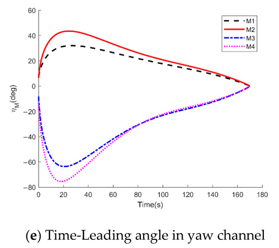 As can be seen from Figure 6a–e, under the action of the cooperative guidance law, the four UAVs gradually approach and finally strike the target. From Figure 6b–e, it can be seen that the time for the UAVs to reach the target is 170 s, which is the same as the desired impact time, which indicates the effectiveness of the cooperative guidance law. As can be seen from Figure 6b, the impact time errors of the four UAVs gradually decrease, which reach the same in about 80 s, and converge to zero in the terminal time. As can be seen from Figure 6e, the leading angle in the yaw channel increases in the early stage and then decreases gradually until the terminal time converges to 0.