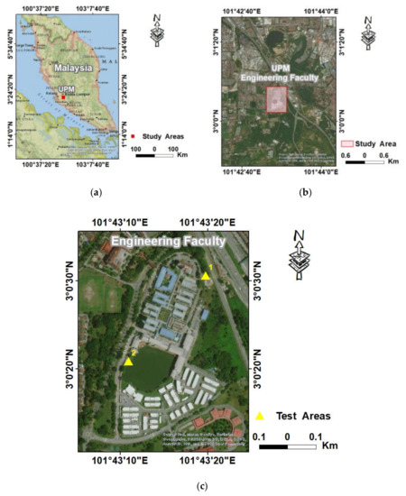 The location map of the study area: (a) map of Malaysia; (b) UPM Engineering Faculty; (c) the test area where the measurements are conducted.