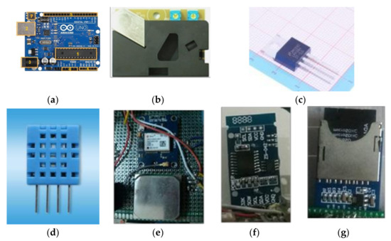 PM2.5 monitoring system components: (a) Arduino UNO R3 board; (b) dust sensor module DSM501A; (c) regulator (LM1084); (d) temperature and humidity sensor; (e) GPS module; (f) real-time module DS3231; (g) SD card logging shield and memory.