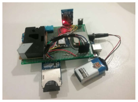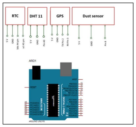 With the board operating at 5 volts, it can easily be powered using a USB computer connection as well as an AC-to-DC adapter or a 9-volt battery as an external supply. The PM2.5 dust sensor and temperature and humidity sensors (DHT11) are connected to the board along with the other components (i.e., NEO-6M GPS module, real-time module DS3231, and Arduino DIY SD card Logging Shield). The Arduino Uno board is programmed using the Arduino Software integrated development environment (IDE).