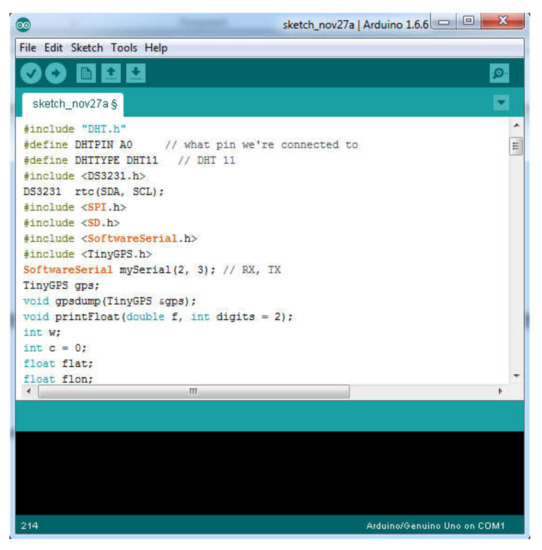 We programmed the Arduino using its open-source IDE to interface with the board [31]. Figure 5 shows a sample of the uploaded code based on Arduino program version 1.6.6.