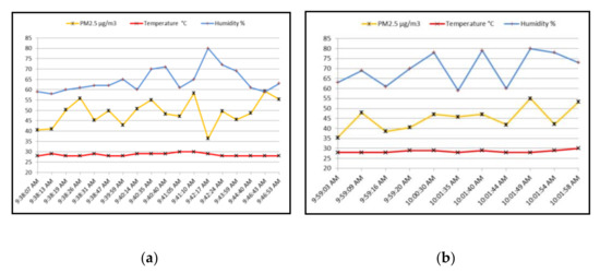 PM2.5 and temperature and humidity data for Test Area I, along the 50-m track flown by the UAV, are as shown in Figure 8a. PM2.5 concentration values range from 36.39 to 59.22 µg/m3, whereas temperature and humidity were within the respective ranges of 28 to 30 °C and 58 to 80%.