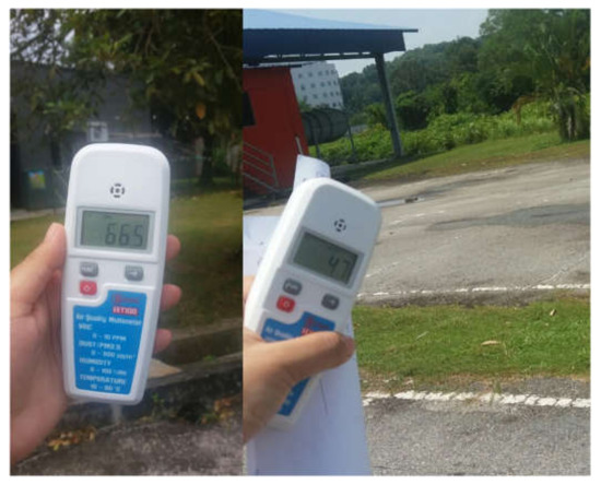Field results were consistent with the above two data sources and comparable with detailed reference data provided by the NASA satellite (i.e., meteorological parameters downloaded via RETScreen Plus program). For PM2.5, all records compared with Air Quality Multimeter were recorded in the same location of each point. Figure 9 shows the testing by Air Quality Multimeter. An EET 100 integrated high-sensitivity dust sensor, Volatile Organic Compound (VOC) sensor, and temperature and humidity sensors made it possible for us to, respectively, measure PM2.5, VOC, and temperature and humidity, in one multimeter-sensor setup for air quality assessment.