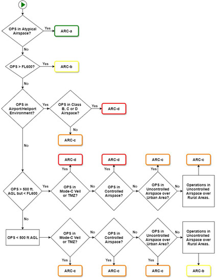 The air risk class (ARC) is an index for the risk of a collision with a manned aircraft. Four classes of air risk are defined: for ARC-a, the risk of collision is so low that no strategic measures have to be taken. The risk increases up to ARC-d. The air risk class depends on the air space and expected air traffic and can be determined with the flow chart of Figure 5. For ARC-b to ARC-d, the risk can be mitigated by several methods.