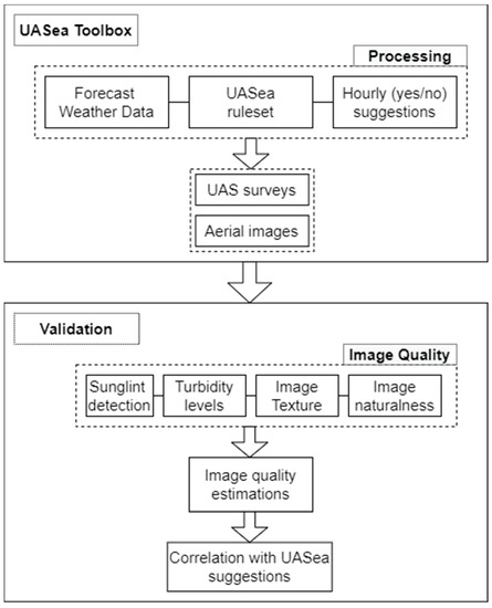 Data acquisition and processing pipeline: UASea toolbox for the identification of the optimal flight times. Validation of the UASea performance through an image quality equation.