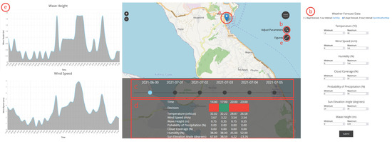 GUI, along with its visual components, is depicted in Figure 3. Users may navigate to the map element by zooming in/out and panning to the desired location and selecting the study area by clicking the map (Figure 3a). After clicking the map, a leaflet marker is created that triggers the “Adjust Parameters” panel and button (Figure 3b). The Adjust Parameters panel consists of an HTML form in which users can adjust the parameters and their thresholds and select one of the available weather forecast data providers. By hitting the submit button, the parameter adjustment panel disappears, and the decision panel becomes available at the bottom of the screen. At the top of the decision panel (Figure 3c), there is a date menu that is used to address the range of the available forecast data, while on the bottom of the decision panel, the results of the UASea toolbox are presented in tabular format (Figure 3d). In the “Decisions” row, green indicates optimal weather conditions, while red stands for non-optimal weather conditions. Finally, a set of figures for each one of the weather parameters is also available through the figures panel (Figure 3e).