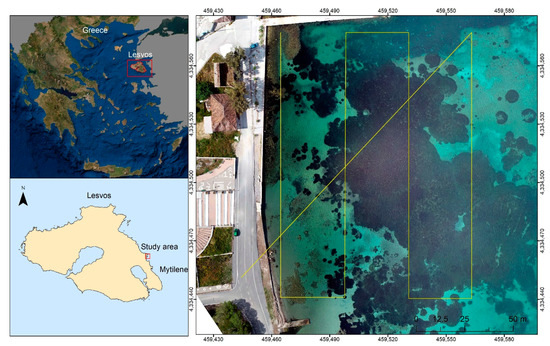 The study area is a coastal area north of the town of Mytilene in Lesvos Island, Greece (Figure 4). The habitats of the seabed include an extended seagrass meadow of Posidonia Oceanica, one of the most significant seagrass species found only in the Mediterranean Sea. The morphology of the seabed also includes sandy areas and mixed types of algae in smaller depths, while the seabed depths range from 0.5 to 8 m. The surveyed area is easy to approach, close to a small harbor, and it belongs to the UAS free-flying zones.
