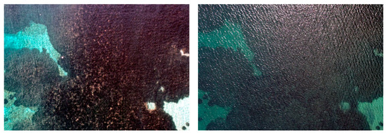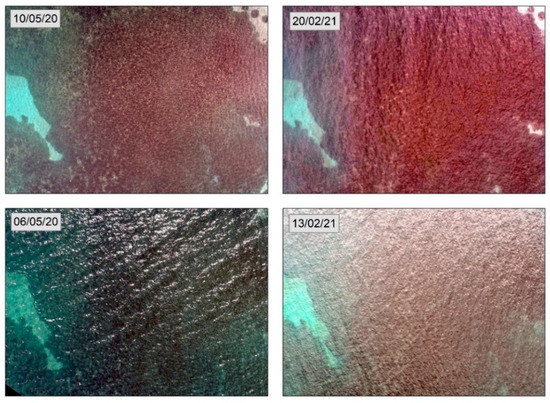 The higher-quality image (left) and the lower-quality image (right) as calculated by the image quality equation are shown in Figure 6. The higher-quality image was captured on 19 February 2021 at 12.00, and its quality estimation is 12, while the lower-quality image was acquired on 21 March 2020 at 13.00, and its quality estimation is 61. On the first date, the sunglint and turbidity percentages are very low, the texture of the image is smooth, and the BRISQUE estimation is 4.4, the fourth lower naturalness estimation of the dataset. The sea surface is calm, and the illumination of the seabed is sufficient for the distinction of marine habitats. On the second date, the sunglint covers 2.81% of the image, the sea surface texture is rough, and the BRISQUE estimation is 28.85, one of the higher image naturalness estimates of the dataset. The sea surface conditions prevent the clear visibility of the seabed, affecting the mapping of the habitats.