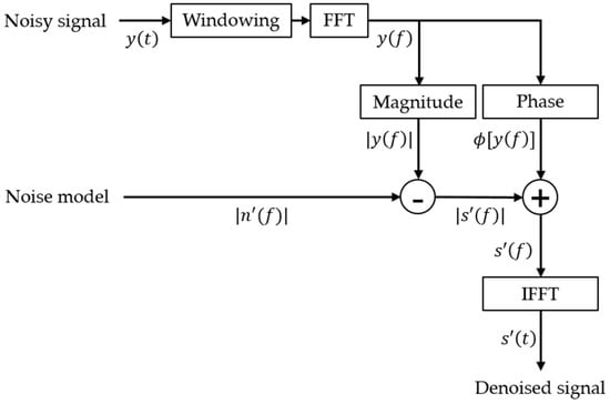 Spectral subtraction is a method of restoring a signal by subtracting estimates of noise from a noisy signal []. In a noisy environment, the measured signals are represented by the sum of the signals of interest, , and noise, . Here, the signal of interest is the signal we want to measure, and noise is the signal we want to remove, not the signal of interest: