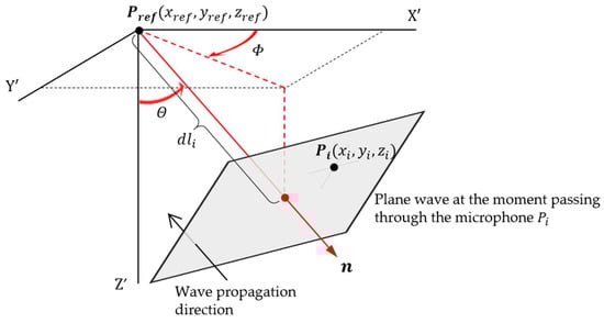 is the acoustic pressure measured on the microphone and relative time delay, is the relative time delay caused by the position of each microphone, is the weight and does not give a differentiated weight, represents the number of stagnant microphones used, and represents the microphone index. Beam power is calculated for each direction of arrival of a hypothetical acoustic source. The magnitude of the calculated beam powers is determined for the direction of arrival of the acoustic source by making a relative comparison in the entire virtual source space and estimating the direction of arrival with the maximum value. The phase of the sound pressure signal measured between the reference point of the microphone, , and the position between each microphone, , is caused by a time delay, ; is analytically related by speed of sound, , and delay distance, , as in Equation (3) [,], and is calculated from the position vector defined as and and the incident direction of the plane wave, i.e., the normal vector of the plane wave, (Figure 2). The normal vector of the plane wave is the relation between the azimuth angle, , and elevation angle, , which can be represented in the spherical coordinate system. The speed of sound was corrected by atmospheric temperature, [], as follows: